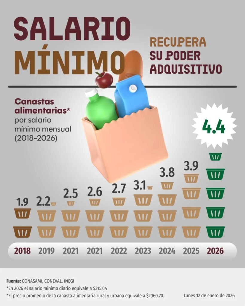 De acuerdo con información oficial, el aumento del salario mínimo ha sido progresivo: pasó de 2.2 canastas en 2019, a 3.1 en 2023, 3.8 en 2024, 3.9 en 2025 y alcanzaría 4.4 en 2026, considerando un salario mínimo diario de 315.04 pesos y un precio promedio de la canasta alimentaria de 2,160 pesos mensuales.